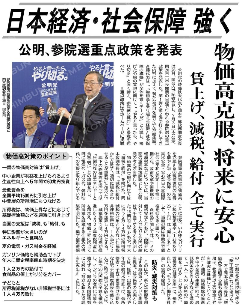参議院選挙へ向け公明の重点政策が出ました。 物価高対策から防災対策まで、いずれも現場の声を踏まえた政策ばかりです。 投票日は7月20日。 自分の言葉で重点政策を訴え切っていきます! 賃上げ、減税、給付全て実行