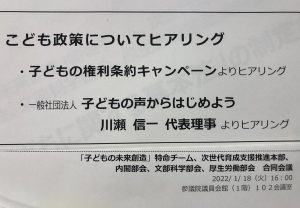 党の合同会議で、子どもの声を尊重する社会に必要な ①子ども基本法②子ども家庭庁③権利擁護機関(子ども…