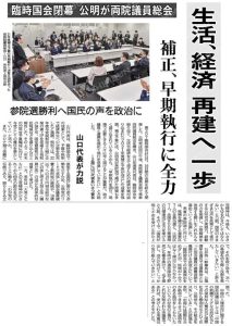 臨時国会閉幕 公明が両院議員総会 補正、早期執行に全力 山口代表が力説 参院選勝利へ国民の声を政治に…
