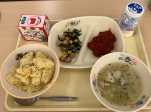 令和3年度の文科大臣学校給食表彰を中学校で唯一受けた学校です。校長先生と栄養教諭の先生から、旬の食材…