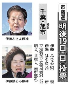 千葉・旭市議選はあさって19日(日)投票。伊藤ふさよ、伊藤はるみの2候補の応援を宜しくお願い致します…